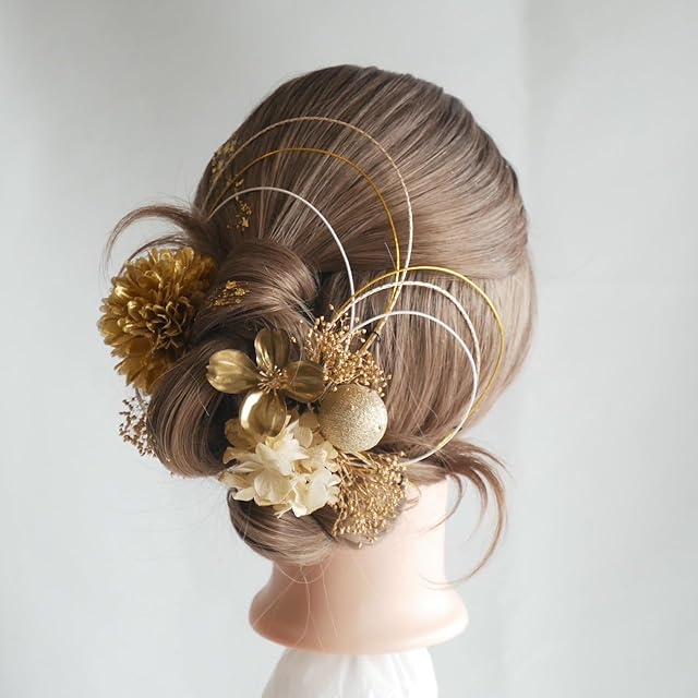 商品名:[Lomeri ロメリ] ゴールド マムの髪飾り ドライフラワー 和玉 水引 成人式 結婚式 前撮り U1 (ゴールド)