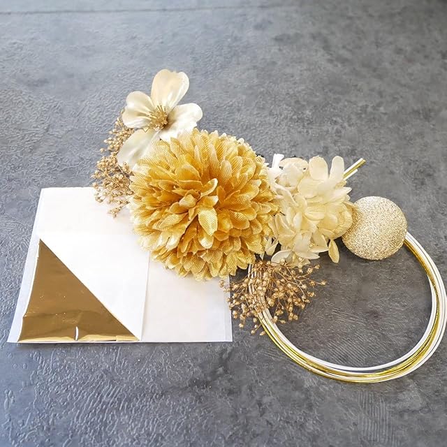 パーツ詳細ドライフラワー 4パーツ、 アートフラワー 2パーツ、 和玉ピック、 金箔、 水引 約90cm (白2本、ゴールド1本)