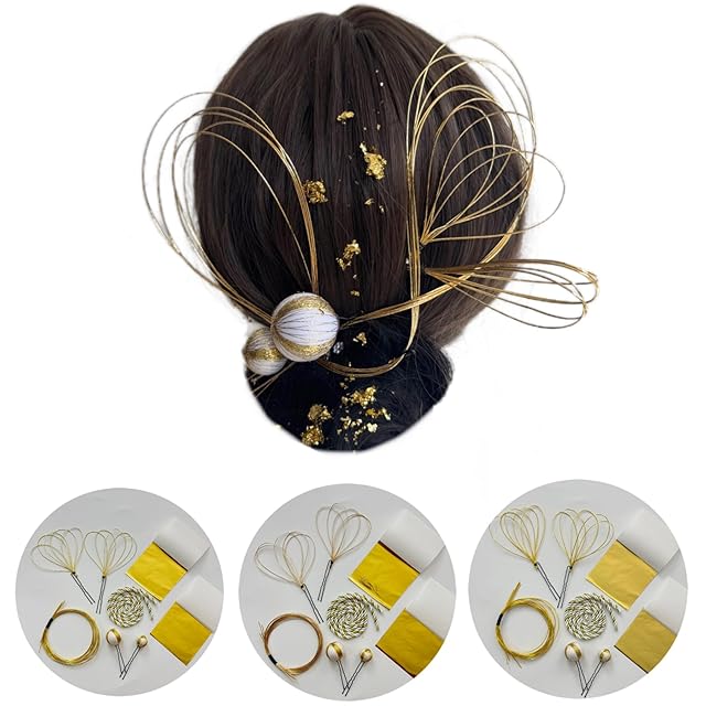 ■髪飾り7点セットで、水引と紐があります、とてもリアル,カラーマッチングもとても繊細。7個のヘアアクセサリーを組み合わせてお気に入りのスタイルにすることも、個別に使用することもできます。今年人気の要素である金箔が付属して,より高級感が溢れます。使いやすい:Uピンなので、簡単でつけやすい、様々なヘアースタイルに合わせやすいです。