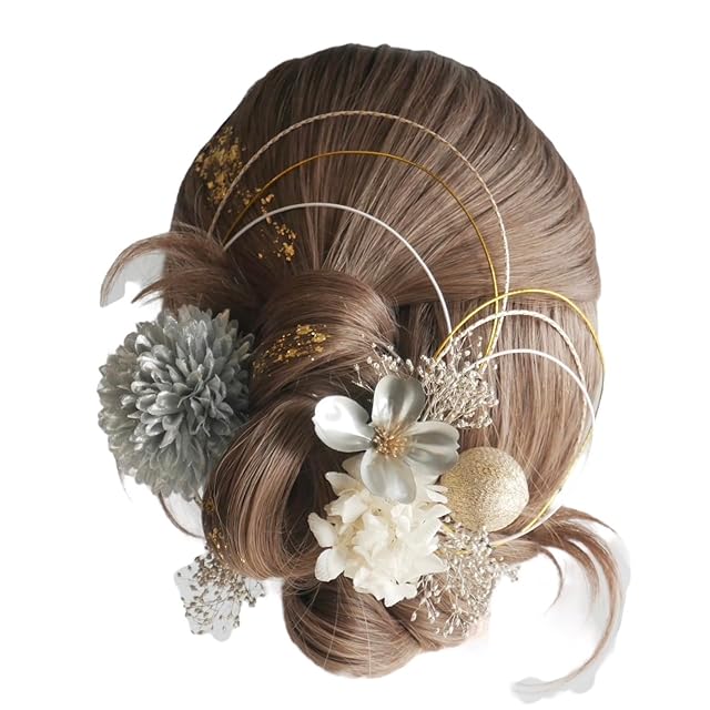 [Lomeri ロメリ] ゴールド マムの髪飾り ドライフラワー 和玉 水引 成人式 結婚式 前撮り U2 (シルバー)