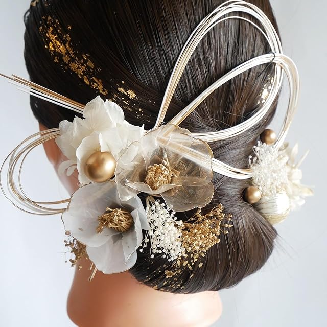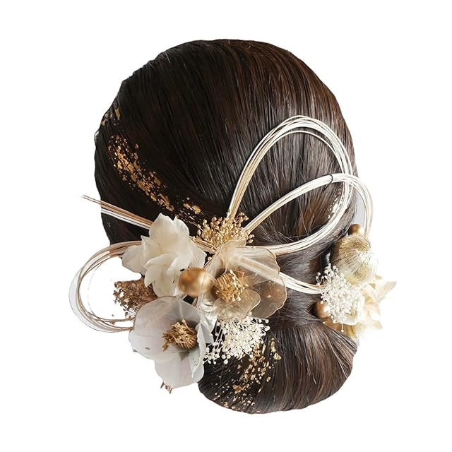 [Lomeri ロメリ] タイトヘア 髪飾り おかみさん ロメリ ドライフラワーの髪飾り 成人式 卒業式 結婚式 袴 G11(白ゴールド)