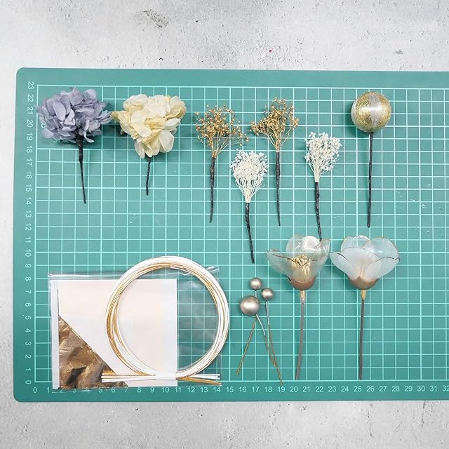 パーツ詳細水引 ブロンズ4本 白3本(約90センチ)、ドライフラワー6パーツ、クリア椿2パーツ、ブロンズパール、和玉小 白ゴールド、ブロンズ箔シート