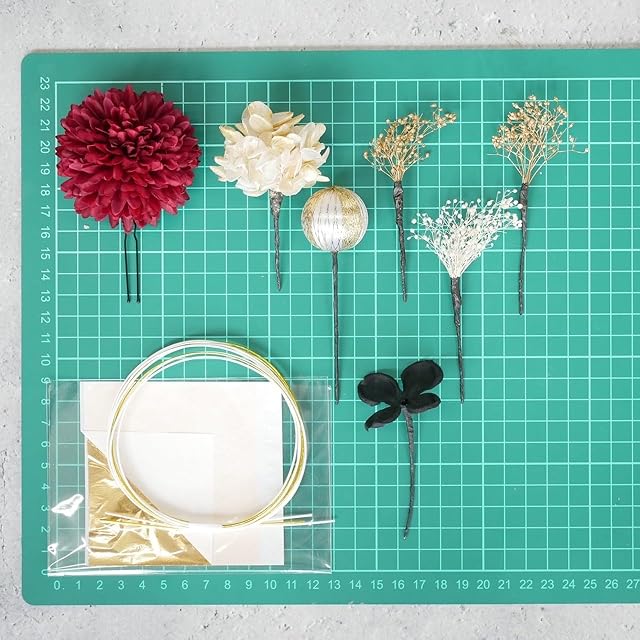 パーツ詳細ドライフラワー 4パーツ、 アートフラワー 2パーツ、 和玉ピック、 金箔、 水引 約90cm (白2本、ゴールド1本)