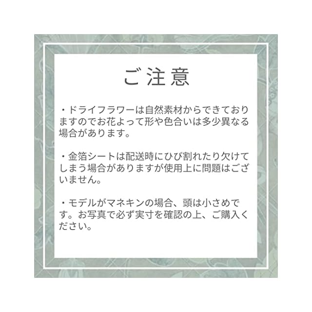 ※プリザーブドフラワー(ドライフラワー)は非常に繊細です。一度壊れてしまいますと元には戻りませんので、お取り扱いは優しくお願いいたします。※造花は何度でも繰り返しお使いいただけます。※モデルの頭は少し小さめです。ご購入前に個々のお花の大きさを必ずご確認お願いいたします。 ※お手持ちのモニターによりお色味が実際の商品と異なって見える場合がございます。※プリザーブドフラワー(ドライフラワー)は本物のお花から作られておりますので、個々のサイズやお色味が若干異なる場合がございます。