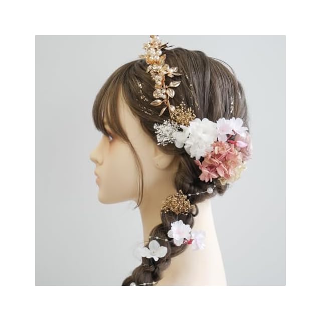 商品名:[Lomeri] ロメリ ゴールド カチューシャ ドライフラワーの髪飾り 成人式 卒業式 結婚式 袴 E32 (ピンク)
