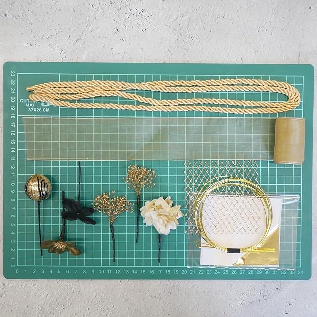 パーツ詳細オーガンジーリボン 約80cm、組紐 約130cm、ドライフラワー 3パーツ、造花2パーツ、和玉、ゴールドメッシュ、水引3本 約90cm、金箔シート