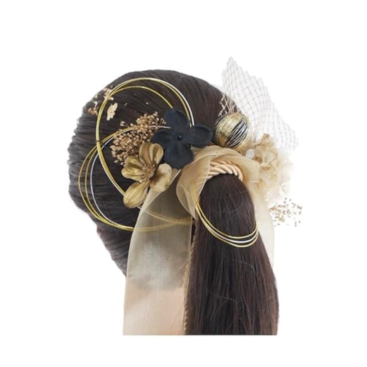 [Lomeri ロメリ] 組紐とオーガンジーリボンの髪飾り ドライフラワー ポニーテール 髪飾り 成人式 卒業式 振袖 結婚式 和装 F1 (ゴールド)