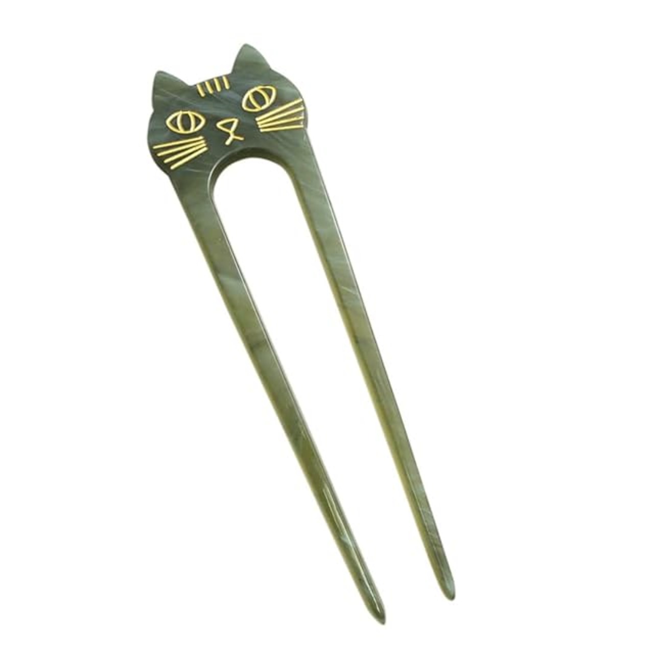 商品名:[ヴァンテーヌ VINGTAINE] 猫 モチーフ 二股 かんざし マーブル 二又 キャット ヘアアクセ H7530-GN- グリーン