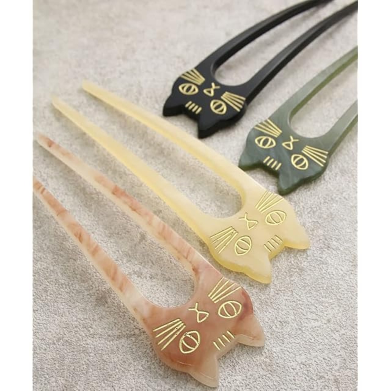 愛らしい猫のフェイスがポイントのかんざし。艶めきが可愛いマーブル模様のニュアンスカラーに、シンプルなブラック。二股かんざしは1本かんざしより、ホールド力もありねじってアップしたヘアをしっかりとまとめてくれます。モチーフが可愛いので団子に束ねたヘアに飾りとして差し込んでも可愛いです。