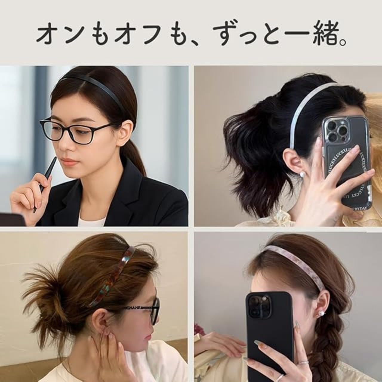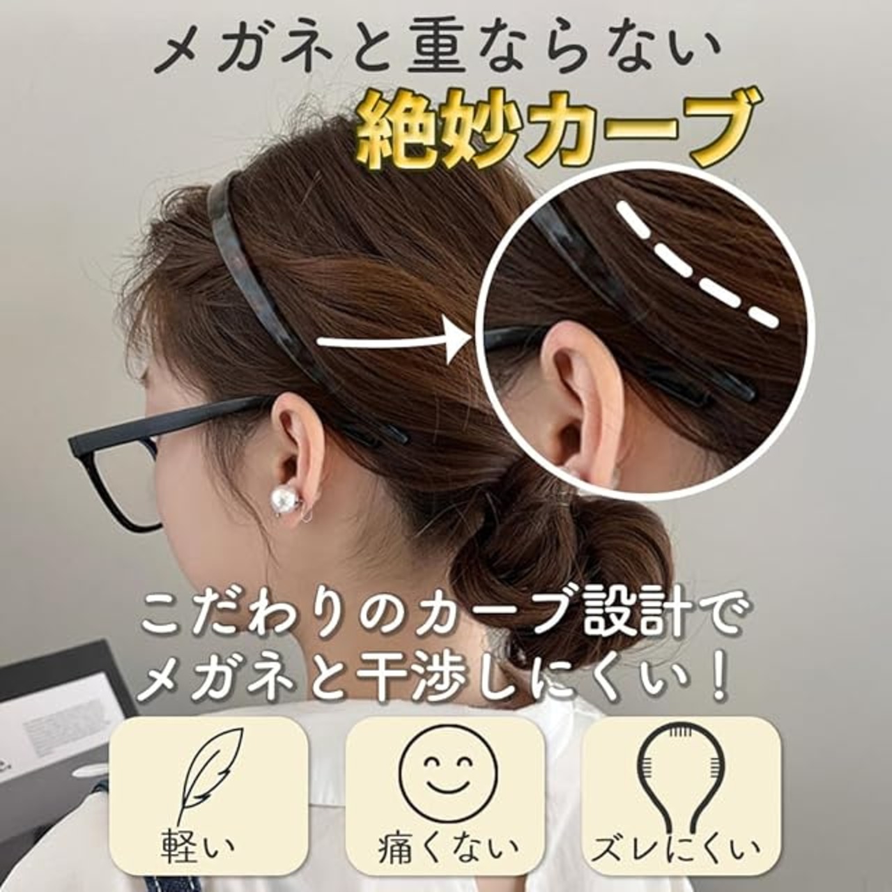 【メガネと重ならない絶妙カーブ】メガネと干渉しづらいこだわりのカーブ設計。耳元を圧迫しにくく、長時間つけても快適なフィット感。痛くなりにくい工夫が満載です。<br/> 【ずっと着けたくなる軽やか心地】軽量設計&丸みのある先端で、優しくフィット。内側には、滑り止めの櫛が3箇所あり、ズレにくく、ヘアスタイルも美しくキープ。 ※着け心地には個人差があるため、合わないと感じた場合は無理せずご使用をお控えください。<br/> 【上品な輝き、高級アセテート素材】素材には「高級アセテート」を採用。カラーは、ブラック、ピンク系、ブラウン系、ホワイト系の4色展開。透け感・光沢感・柄など、それぞれ異なる質感が楽しめます。きっと、あなたにぴったりの一色が見つかるはずです。<br/> 【オンもオフも、自然におしゃれ】オフィスでもお出かけでも、さりげなくなじむ美フォルム。寝癖カバーにもぴったりで、時短&きちんと感を叶えます。<br/> 【素材・サイズについて】素材:高級アセテート / 幅:約1cm / 縦:約14.5cm / 横:約11.5cm ※商品により若干の個体差があります。
