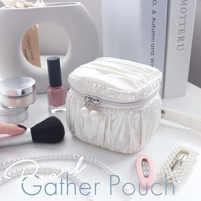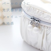 光沢感が美しいスクエアポーチ:光沢のある白いギャザー生地を採用し、パールのような美しいポーチです。 ジッパー部分にもパールをモチーフにしたチャームが付いています。