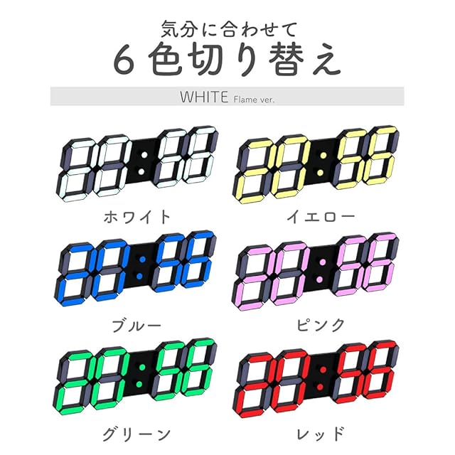 SNSで話題の3Dデジタル時計が大きくなって新登場!より壁掛けに特化した新機能が盛りだくさん!<br>リモコン付きなので壁掛けしても操作が楽々。手の届かない位置への設置もばっちり。<br>どんなインテリアにもマッチする定番の「ホワイト」「ブラック」フレームをご用意。LEDは6色調色可能なのでインテリアや気分に合わせていつでも自由にリモコン一つで変更できます。<br>昼も夜も快適に過ごせる自動調光機能搭載!99段階の手動調光も可能!リモコン一つで調節ができるので壁掛け時計には嬉しい機能。<br>時刻設定は秒まで細かく設定可能。1ヵ月で約1.5秒程しかズレない高精度。再設定もリモコン操作でいつでも楽々♪<br>定番の機能もばっちり搭載。2組までセットできるアラーム機能や、カウントアップ/ダウンもボタン一つでいつでも使えてとっても便利。<br>時刻・カレンダー表示の他に温度表示ができるので、お子様やペットがいるご家庭で安心してお使い頂けます。<br>※商品写真はできる限り実物の色に近づけるよう徹底しておりますが、 お使いのモニター設定、お部屋の照明等により実際の商品と色味が異なる場合がございます。セット内容:時計本体×1、リモコン×1、書兼説明書×1、台紙×1、給電用USBケーブル×1、電源アダプター(PSE認証済)×1、取付フグ×3<br>カラー:フレームホワイト、フレームブラック<br>サイズ:高さ13×横幅37×奥行2.5(cm) 重量380g<br>仕様:定格電圧:DC5V、使用環境温度:0℃〜55℃<br>機能:リモコン操作、カレンダー表示、温度表示、12/24表示切替、時刻/温度表示切替、99段階手動調光、自動調光、6色調色、2組アラーム機能、99分カウントアップ/ダウン、秒設定、「:」表示切替、設定記憶<br>