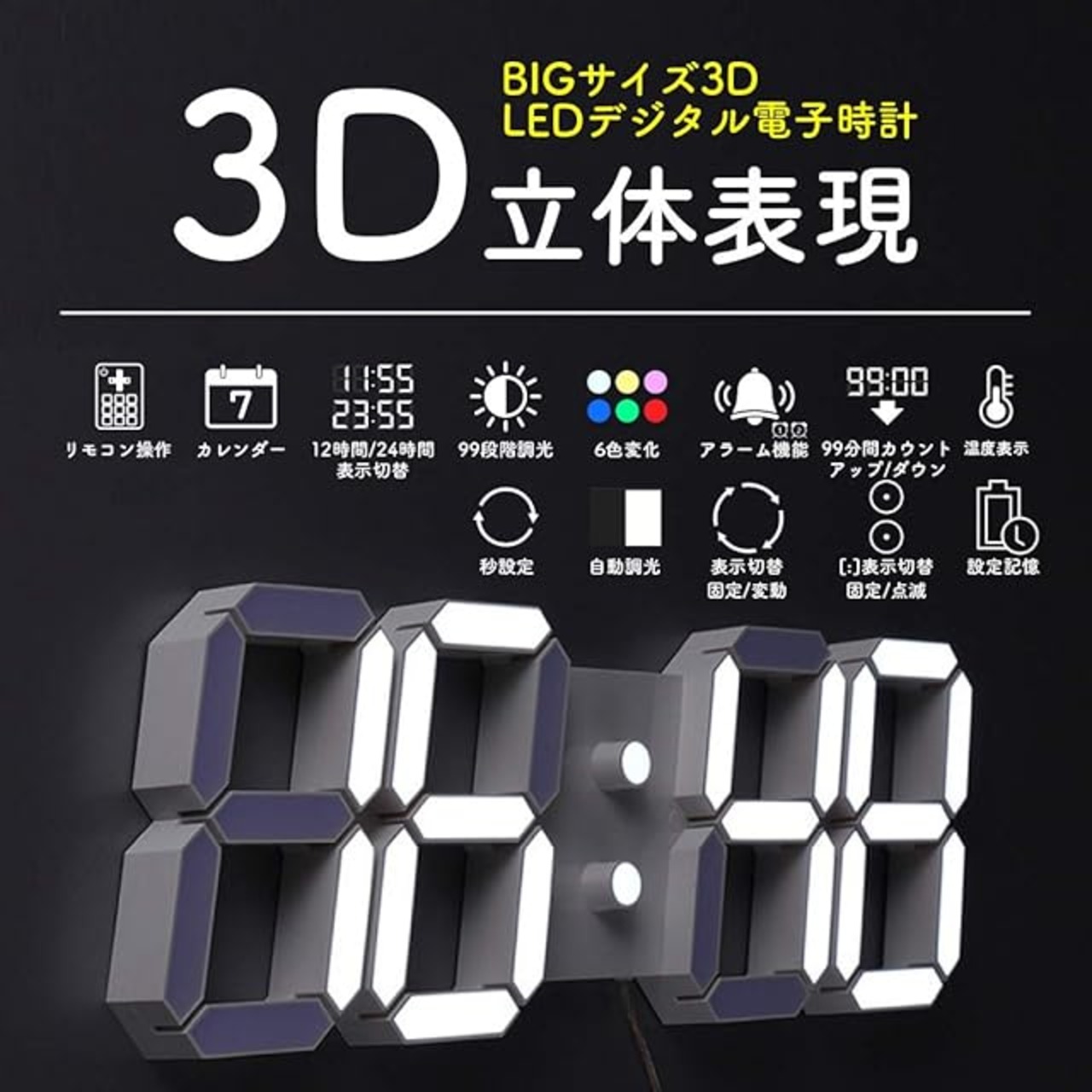 機能:リモコン操作、カレンダー表示、温度表示、12/24表示切替、時刻/温度表示切替、99段階手動調光、自動調光、6色調色、2組アラーム機能、99分カウントアップ/ダウン、秒設定、「:」表示切替、設定記憶