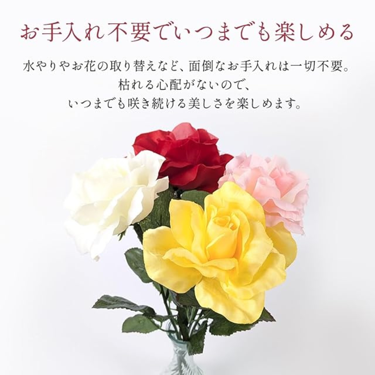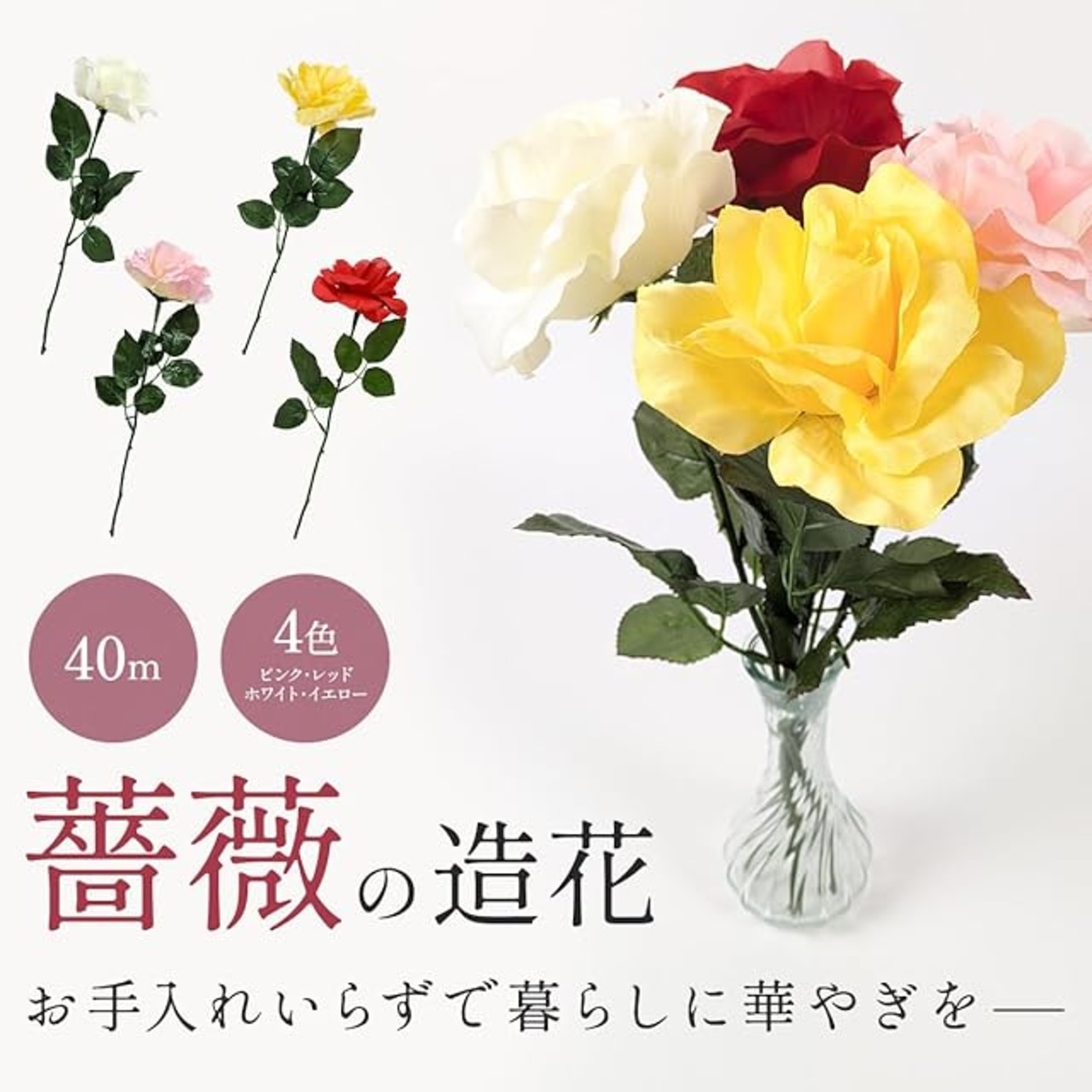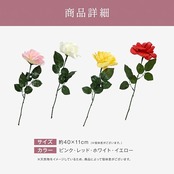 お手入れの要らない薔薇の造花です。 華やかに咲く一輪の薔薇。 装飾等にお使いください。 サイズ(約)40cm x 11cm (天然物をイメージしているので、商品によって個体差がございます)