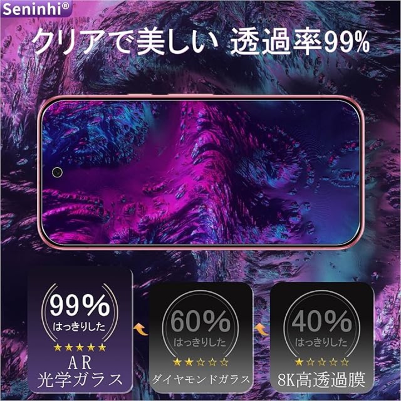 ★【高い透過率】新しくアップグレードした光学プロジェクション技術を使用して、より高い光透過率があり、超クリアな視覚体験を与えます。透過率99%超えのガラスフィルムで、液晶画面の鮮明度を損なうことなく、画面本来の美しさをそのまま表現します。裸画面の視覚感があるので、いずれ映画を見るか、ドラマを見ても、効果は非常に優れます。