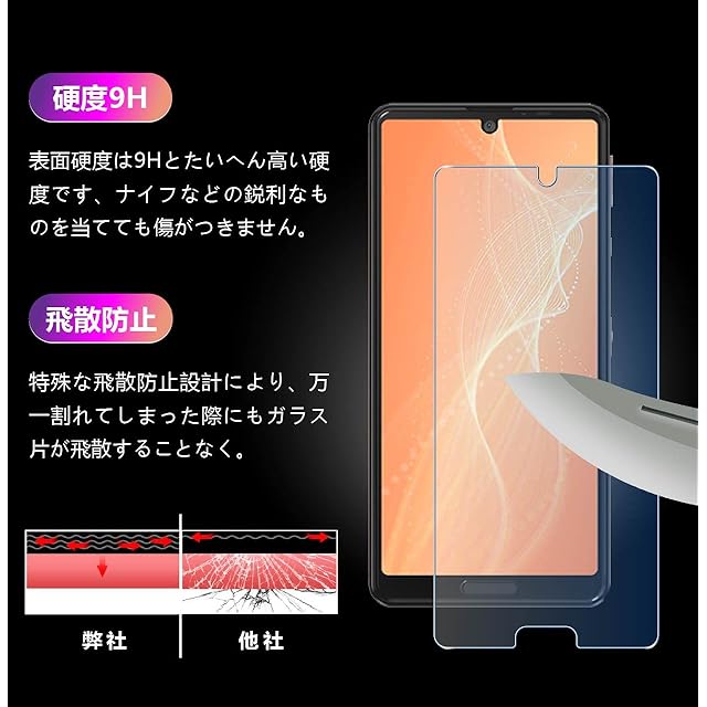 <br><b>対応機種:対応 AQUOS sense4 SH-41A / AQUOS sense4 lite 用の </b> <br> <br><b>商品のセット内容</b> <br>◎フィルム2シート <br>◎スクリーン清潔ツール2セット <br> <br><b>硬度9H耐衝撃飛散防止</b> <br>カッターなどの鋭利なものを当たってもキズが付きにくくて高い強度を持ち表面硬度9Hが特徴です。 <br>飛散防止処理により、ガラスを落として割れても飛散しません。 <br> <br><b>防汚疎水性指紋防止</b> <br>耐油性/抗菌性に優れ、ガラス飛散防止特殊加工/撥水性に加え、指紋などの汚れがついても拭取るだけでキレイに。 <br> <br><b>高い光透過率滑らかなタッチ</b> <br>高品質の旭硝子を採用しており、光の透過率が99%で、元々の画質が損なわれません。 <br>接着面は気泡の入りにくい特殊な自己吸着タイプです。 <br>スムーズな操作性(フィルムと比較して、快適な操作性は持続可能。<br> <br><b>貼り付け方法の手順</b><br>1.湿布で画面の汚れを拭く<br>2.乾いた布で画面を拭く<br>3.ダストステッカーでほこりを取り除きます。 <br>4.離型フィルムを引き裂き、画面の各穴とエッジにフィルムを向け、ゆっくりと下げます。 <br>5.中間部を指で押して、フィルムをゆっくりとスクリーンに吸着させます。