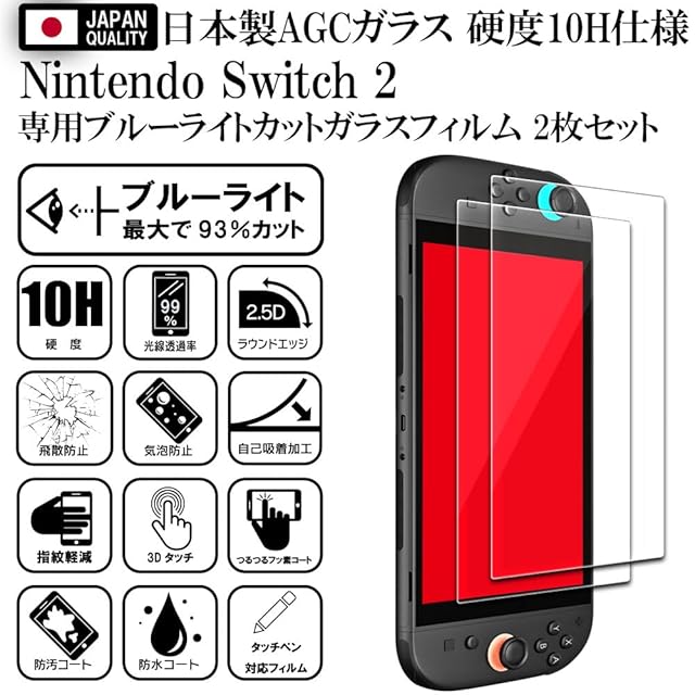 【ブルーライトカット97%】【2枚入】【日本AGCガラス】Switch 2 保護フィルム Switch2 / スイッチ2 用 ガラスフィルム フィルム 強化 ガラス 高透過 高光沢 日本製 旭硝子 硬度10H 2.5Dラウンドエッジ 自動吸着 気泡ゼロ 飛散防止 指紋防止 撥水撥油 3D タッチ For Nintendo Switch 2 / スウィッチ2