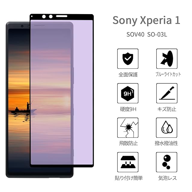 対応機種:Xperia1 SOV40 SO-03L(エクスペリア 1 )用ブルーライトカット強化ガラスフィルム。<br>硬度9H/ラウンドエッジ加工/高感度タッチ/指紋・汚れ防止/飛散防止/貼り付け簡単。<br>機種の選択には間違いがないよう、ご注文前によくお確かめください。
