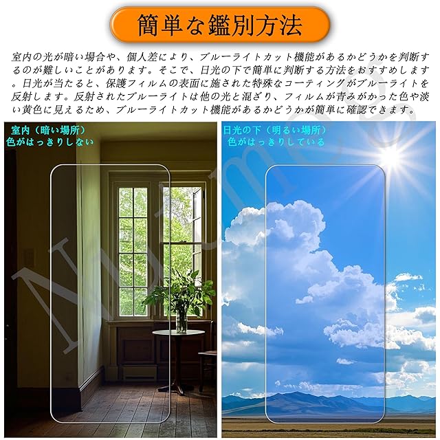 【特別なご案内】:ブルーライトカット処理が施されているため、室内の光ではブルーライトフィルムの色が見えにくくなっています。日光の下では、色がより明確に見えることがありますが、使用角度や環境によって、フィルムが淡い青色や薄い黄色に見えることがあります。何卒ご了承ください