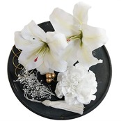 内容:カサブランカ15cm 2点、白ダリア1点、プリザーブドフラワーカスミ草3点、金ボール3点付1点、金水引1点、白タッセル1点 ※商標5952326号取得済み