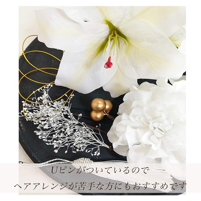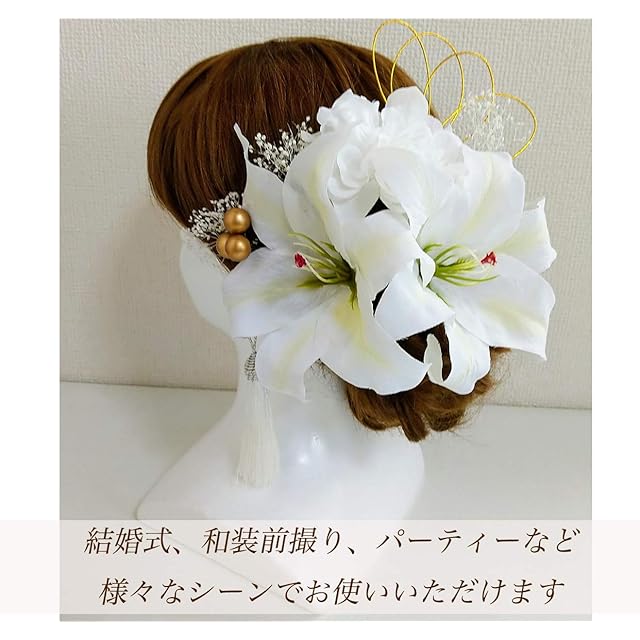 本物に近い造花(アーティフィシャルフラワー)でお作りしたカサブランカ ゆりの髪飾りのセットです。<br> 一点一点手作りのハンドメイドなので、細部まで繊細で上品な作り。お花に存在感がありとっても華やかにお召しいただけます。<br> Uピンで留められるので角度も変えやすくアップスタイル、ダウンスタイルなど様々なヘアアレンジに対応できます。<br>トップ、サイド、シニヨンなど付ける位置を変えることでイメージを変えることができます。挙式と披露宴で イメージを変えたい方にもぴったりです。<br> 結婚式、披露宴、ブライダルはもちろん、成人式、和装前撮り、卒業式、七五三、お正月、ひな祭り、など様々なイベントでお使いいただけます。<br>内容 :カサブランカ15cm 2点、白ダリア1点、プリザーブドフラワーカスミ草3点、金ボール3点付1点、金水引1点、白タッセル 1点