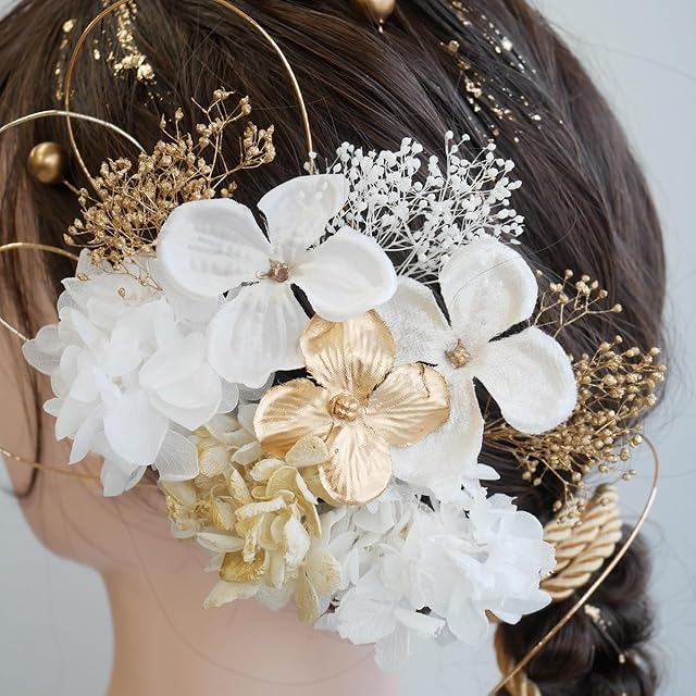 [Lomeri] ロメリ【6色展開】水引アレンジの髪飾り ドライフラワー 成人式 卒業式 結婚式 袴 K25 (白×ゴールド)