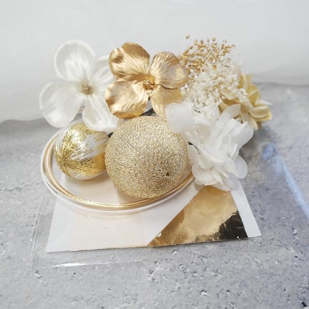パーツ詳細ドライフラワー 4パーツ、アートフラワー 1パーツ、水引 約90cm(ブロンズ1本、白1本)、和玉 白ゴールド 小、ブロンズ 大、ゴールド小花、ブロンズ箔