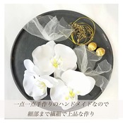 【素材:サイズ】胡蝶蘭 コチョウラン 造花 9〜11cm 3点、白チュール2点、金水引1点、金ボール2点、ゴールドかすみ草ブリザーブドフラワー1点 カラー:ホワイト 白 ※商標5952326号取得済み