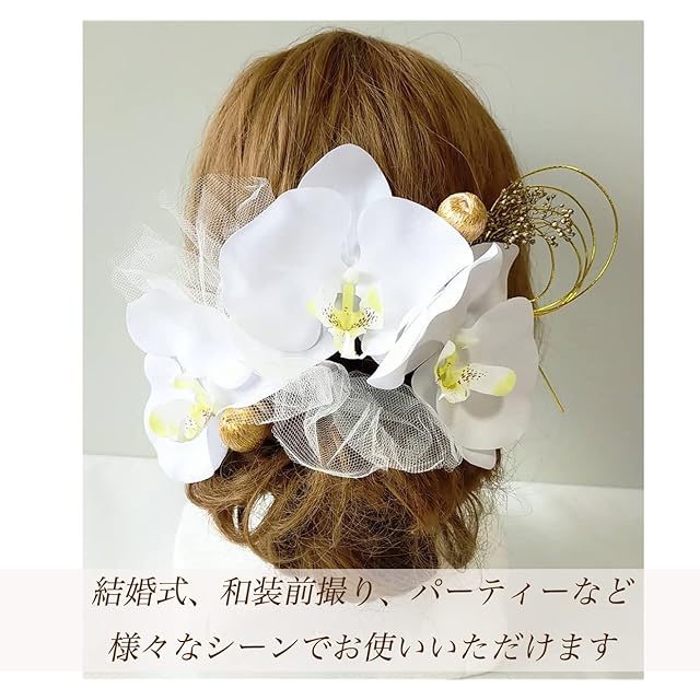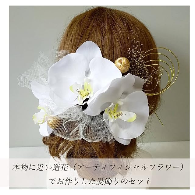 【J's select】胡蝶蘭 チュール レース 花 フラワー 髪飾り 9点セット 和装 結婚式 ウェディング 成人式 卒業式 着物 袴に <br>本物に近い造花(アーティフィシャルフラワー)でお作りした髪飾りのセットです。<br>一点一点手作りのハンドメイドなので、細部まで繊細で上品な作り。お花に存在感がありとっても華やかにお召しいただけます。<br>Uピンで留められるので角度も変えやすくアップスタイル、ダウンスタイルなど様々なヘアアレンジに対応できます。トップ、サイド、シニヨンなど付ける位置を変えることでイメージを変えることができます。挙式と披露宴で イメージを変えたい方にもぴったりです。<br>結婚式、披露宴、ブライダルはもちろん、成人式、和装前撮り、卒業式、七五三、お正月、ひな祭り、など様々なイベントでお使いいただけます。<br>【素材:サイズ】胡蝶蘭 コチョウラン 造花 9〜11cm 3点、白チュール2点、金水引1点、金ボール2点、ゴールドかすみ草ブリザーブドフラワー1点 カラー:ホワイト 白