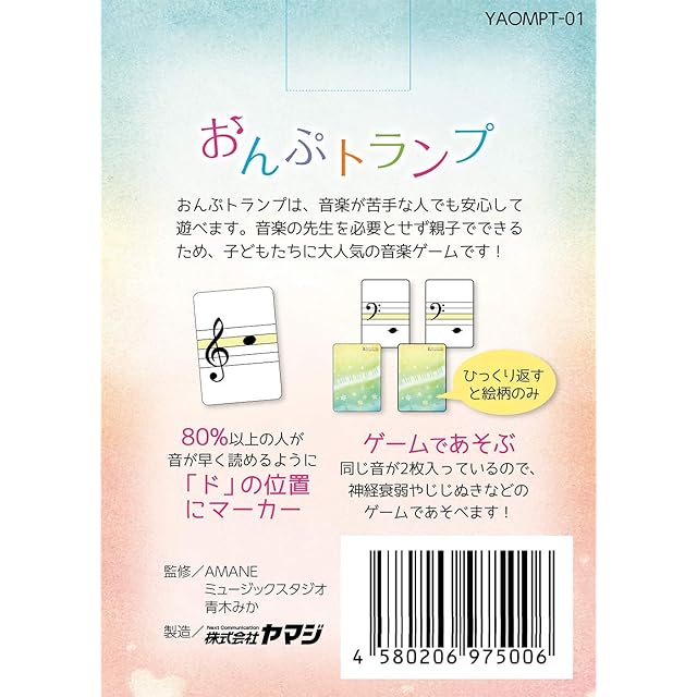 おんぷトランプはクラウドファンディングで商品化になりました! おんぷトランプは、音楽が苦手な人でも安心して遊べます。音楽の先生を必要としない、親子でできる子供たちに大人気の音楽ゲームです。「おんぷトランプ」で、音楽を楽しむ子供達の生き生きとした笑顔を日本中に広げたいと考えています。 おんぷトランプでできる3つのこと 音楽であそぶ おんぷトランプは、音楽が苦手な人でも安心して遊べます。音楽の先生を必要とせず親子でできるため、子供たちに大人気の音楽ゲームです。 音楽を楽しくまなぶ おんぷトランプは、音楽を楽しくまなぶことができます。音がするっと読めるようになることはもちろんのこと、音楽への積極性を高めて、感情表現が豊かになっていきます。 最高に面白いのは自分であそびをつくること 神経衰弱や7ならべなど遊び方は自由。おんぷトランプの遊び方を作ることで創造性を高めます。 おんぷトランプを使ってみて 「ゲームをすることで、笑顔が増え交流のきっかけになりました。」 「音符が早く読めるようになりました。」 「音符を読むことが嫌いだったのに、ゲームに負けたくないという気持ちが出て必死で読むようになりました。もちろん早く読めるようになりました。」 「ピアノも積極的になり、音楽を作りたいと思ってもらえるようになりました。」 「音符を読むことをめんどくさがらなくなり、加線の音(高い音の音符)を読むことにひるまなくなりました。」 「気が付くと、4か月も続けて遊んでいました。」 「曲に感情を乗せることができるようになってきました。」 製品概要 サイズ:横63㎜×縦89㎜(ポーカーサイズ) 紙:トランプ専用紙(透けにくい紙) 加工:カード面に両面マットPP加工(手触りが抜群です)、角R、パッケージプレスコート カード枚数:64枚 カード内訳:おんぷカード 52枚(ト音記号13枚×2セット、ヘ音記号13枚×2セット、正解カード8枚(ト音×4枚、ヘ音×4枚)、なんでもカード(五線譜だけのカード4枚) おんぷトランプの使い方説明ページがあります。 芸術的な感性を伸ばしたいということもあり、パッケージとカード裏面をパステルアートにしました。絵はヒーリングアーティストの長谷川里佳さん。