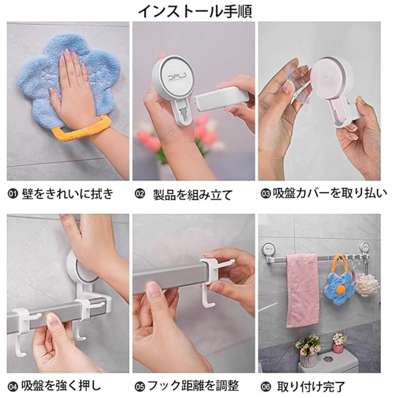 強力吸盤&穴あけ不要:当社の吸盤フックは強力な真空吸盤で固定されており、壁に穴を開ける必要がなく、工具やネジも不要です。一人で簡単に取り付けることができます。ご注意:タイル、ガラス面、大理石面、金属など、ほとんどの種類の滑らかな壁に適していますが、粗いコンクリート壁やレンガ壁など、過度に粗い表面には適していません(注意: 使用する前に、表面にほこりや水滴がないことを確認するために、乾いたタオルで壁をきれいに拭く必要があります。)