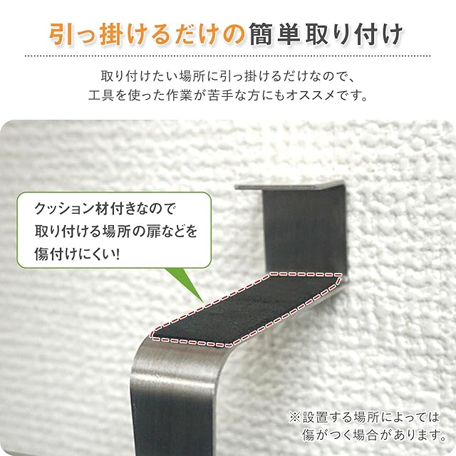 扉に引っ掛けるだけ。壁や扉に穴をあける必要なく、工具不要で簡単設置