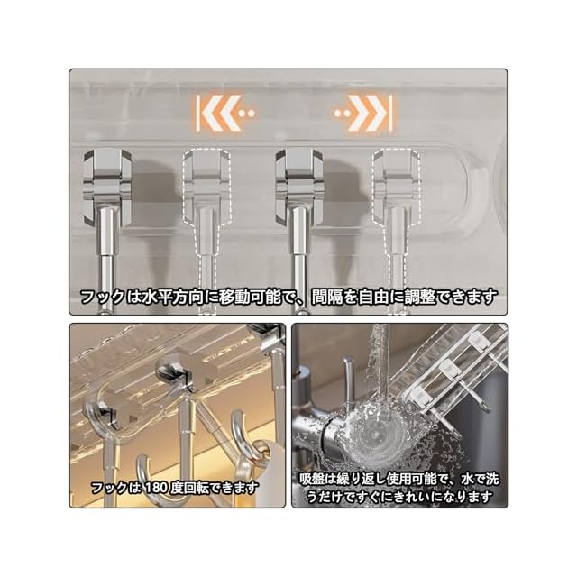 1.キッチンツールフック強力吸着&抜群の耐荷重性、 最大限の安定感を実現。丈夫で耐久性があり荷重がしっかりしていて強力な吸着壁面が落ちない。 2.キッチンツールフックは吸盤で取り付け、吸盤は壁に吸い込むことも、天井に吸い込むこともできる、フック180度回転吸盤は縦にも縦にも掛けられ。 3.インストールキッチンツールフック、 まず壁面をきれいに拭き、フックの背後にある保護シールを引き裂き、最後に必要な位置に置いて右にねじるだけで取り付けに成功、設置はとても簡単で、便利です 4.キッチンツールフック取り外しに傷が残らず、壁面0が残り、繰り返し使用でき、吸盤が汚れているので、洗って乾かしてから使用することができます 5.キッチンツールフック多用途、洗面所や浴室、玄関でも活躍。タイル、大理石、鏡面ガラス、木材など、ほとんどの平滑面にしっかり対応。