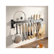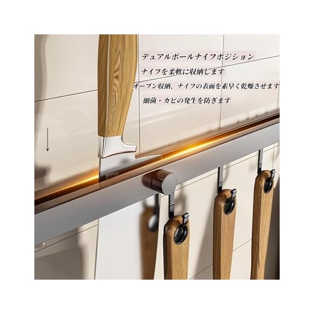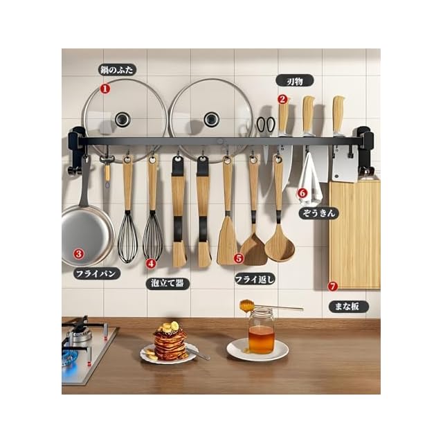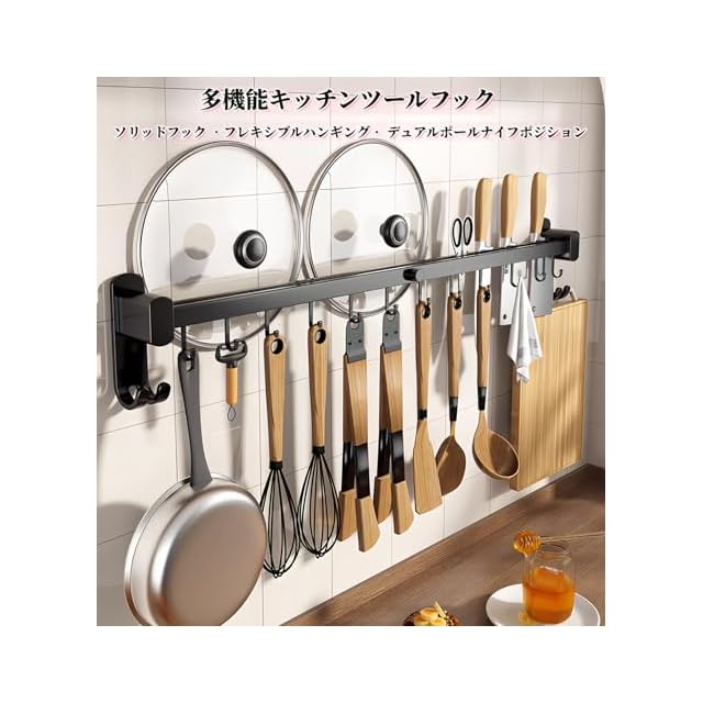 【可動式フック 】可動式フックなので、フックを自由に調整することができます。鍋のふた,刃物,フライパン,泡立て器,フライ返し,ぞうきん,まな板,タオル、お玉などを綺麗に収納することができます。有限の空間を有効活用でき、キッチンをきれいに保ち,キッチンの良い手伝いになります。