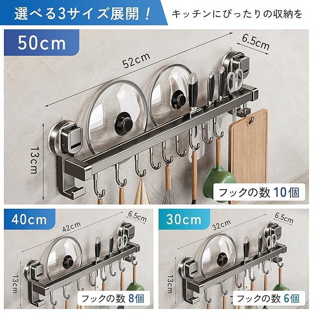 【商品内容】キッチンツールフック 10個フック、重量:229.5g、寸法:幅 50cm x 高さ 13cm x 奥行 6.5cm、吸盤の直径:6cm、吸着円盤の厚さ:0.4cm、素材:アルミニウム(ダブルバー)・TPE(他)