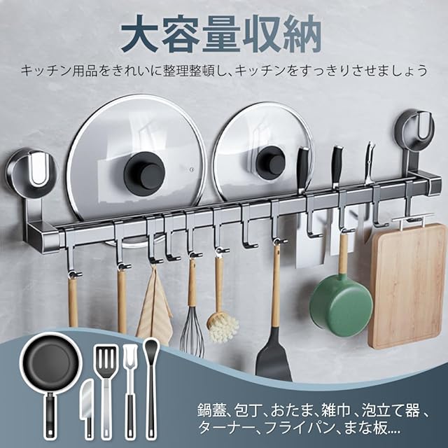 商品名:キッチンツールフック 吸盤 強力 アルミニウム キッチンラック 防水防錆 キッチン収納 調理器具 鍋蓋置き キッチンツール 収納 壁掛け 可動式フック 壁 傷つけない 50cm 10個フック