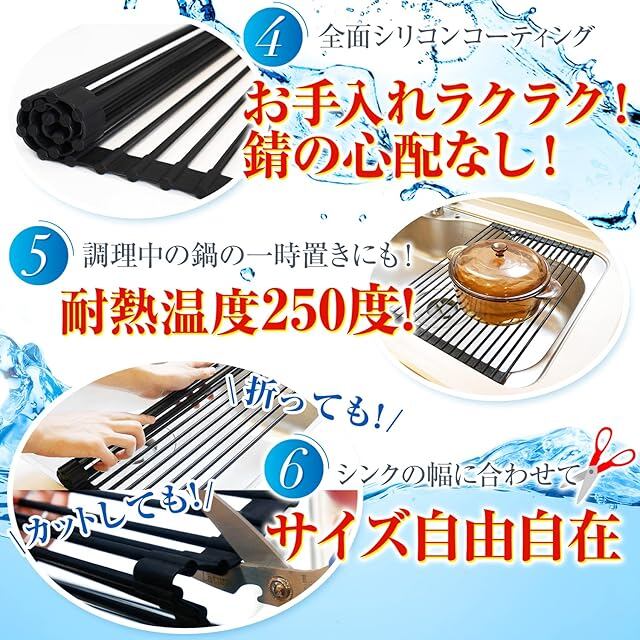 ✅【基本仕様】折り畳み式の水切りラックです。小さく丸めてたためる設計でサイズをご自宅のシンクの大きさに合わせられるので、キッチン周りのスペースを有効活用できます。耐荷重15kg, 耐熱250度の特別仕様のため、2人分の皿・カトラリーなど大容量のものを置いても安定・安心です。さらに棒と棒の間を切ることができるので、お好きな幅に調節できます。※シンクの内径が~38cmまで対応可能※サイズにつきまして、シリコン素材なので若干の個体差(±0.2cm)が生じます。ご了承ください。