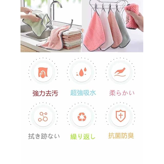 マイクロファイバーの素材は毛先落ちない、柔らかい肌触り、洗濯しやすい、ついた汚れは水洗いで簡単に落とせます。汚れをしっかり絡めとるマイクロファイバー製のクロス。通風性が良い室内で干すと翌朝に素早く乾く。バクテリア発生を抑え、カビが生えにくいです。ふきん キッチンタオル ぞうきん 吸水タオル キッチンクロス 食器ふきん