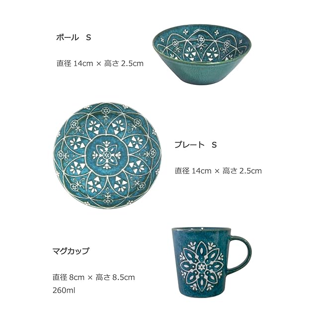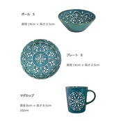 サイズ:プレートL ー直径24cm×高4cm、カレーパスタ皿ー直径20.5cm×高4cm、ボールS ー直径14cm×高2.5cm、プレートSー直径14cm×高2.5cm、マグカップ ー直径8cm×高8.5cm 容量260ml