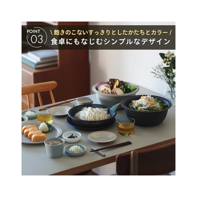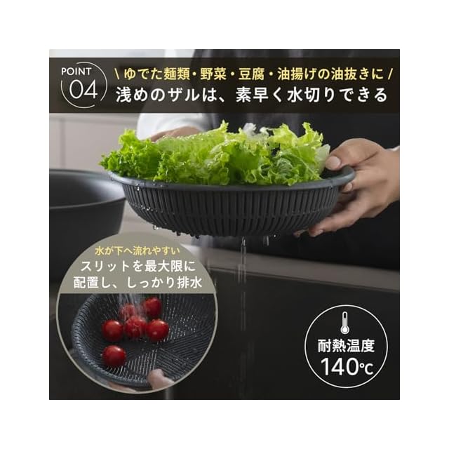 【しっかり排水できるザル】浅めのザルは、ゆでた麺類、野菜、豆腐、油揚げの油抜きなど、 効率よく水切りできます。水が下へ流れやすい構造で、スリットを最大限に配置しているので、しっかり排水。ザルのスリットの角に丸みがあり、 食材が引っかかりにくく、お手入れも楽々。