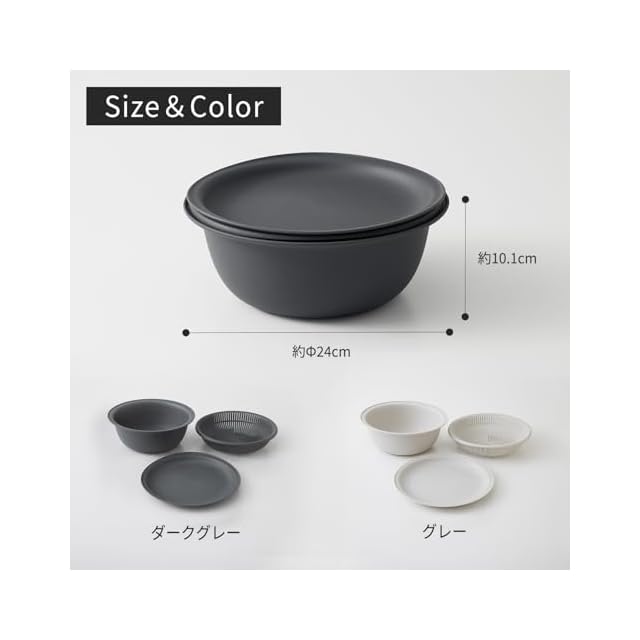 【深さが違うザルボウルセット】<br>フタとして使えるトレーが付いた、ザルボウルセット。深さが違うため、重ねて使えてキッチン台のスペースが広がります。2つの食材をザルとボウルに分けて、一度に電子レンジ調理も可能です。ザルは水が下へ流れやすい構造で、スリットを最大限に配置しているのでしっかり排水できます。ザルのスリットの角には丸みがあるため、食材が引っかかりにくくお手入れも楽々です。<br><br>【ラップやフタの代わりになるトレイ】<br>トレイは、冷蔵庫保存・電子レンジ調理する際のラップの代わりに使用できます。またザルの下に添えれば、水受けにもなります。凹凸をできる限り少なくしたシンプルな形です。