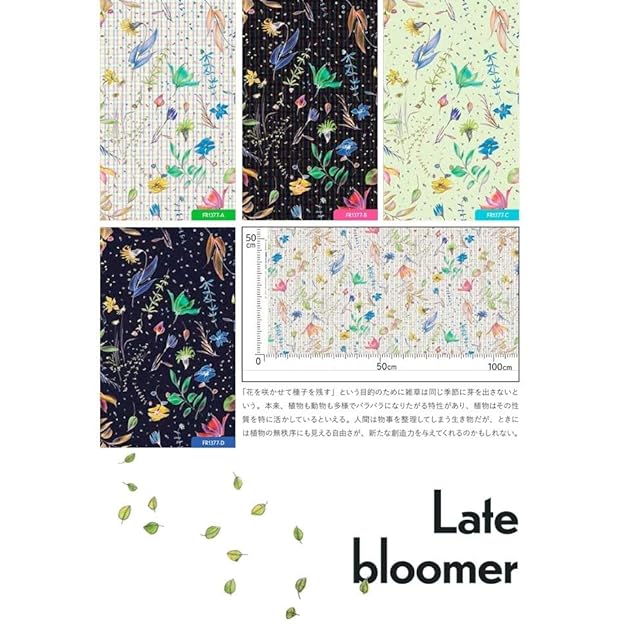 【Late bloomer】<br> 「花を咲かせて種子を残す」という目的のために雑草は<br> 同じ季節に芽を出さないという。<br> 本来、植物も動物も多様でバラバラになりたがる特性があり、<br> 植物はその性質を特に活かしているといえる。<br> 人間は物事を整理してしまう生き物だが、<br> ときには植物の無秩序にも見える自由さが、<br> 新たな創造力を与えてくれるのかもしれない。<br> <br> <br> 生地巾:110cm<br> 素材:綿100%<br> 生地種:20番手シーチング<br> 商用利用可<br>