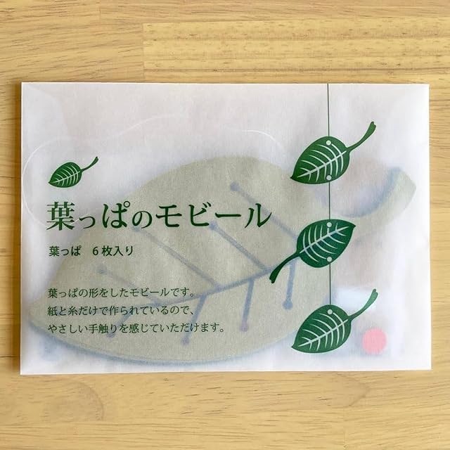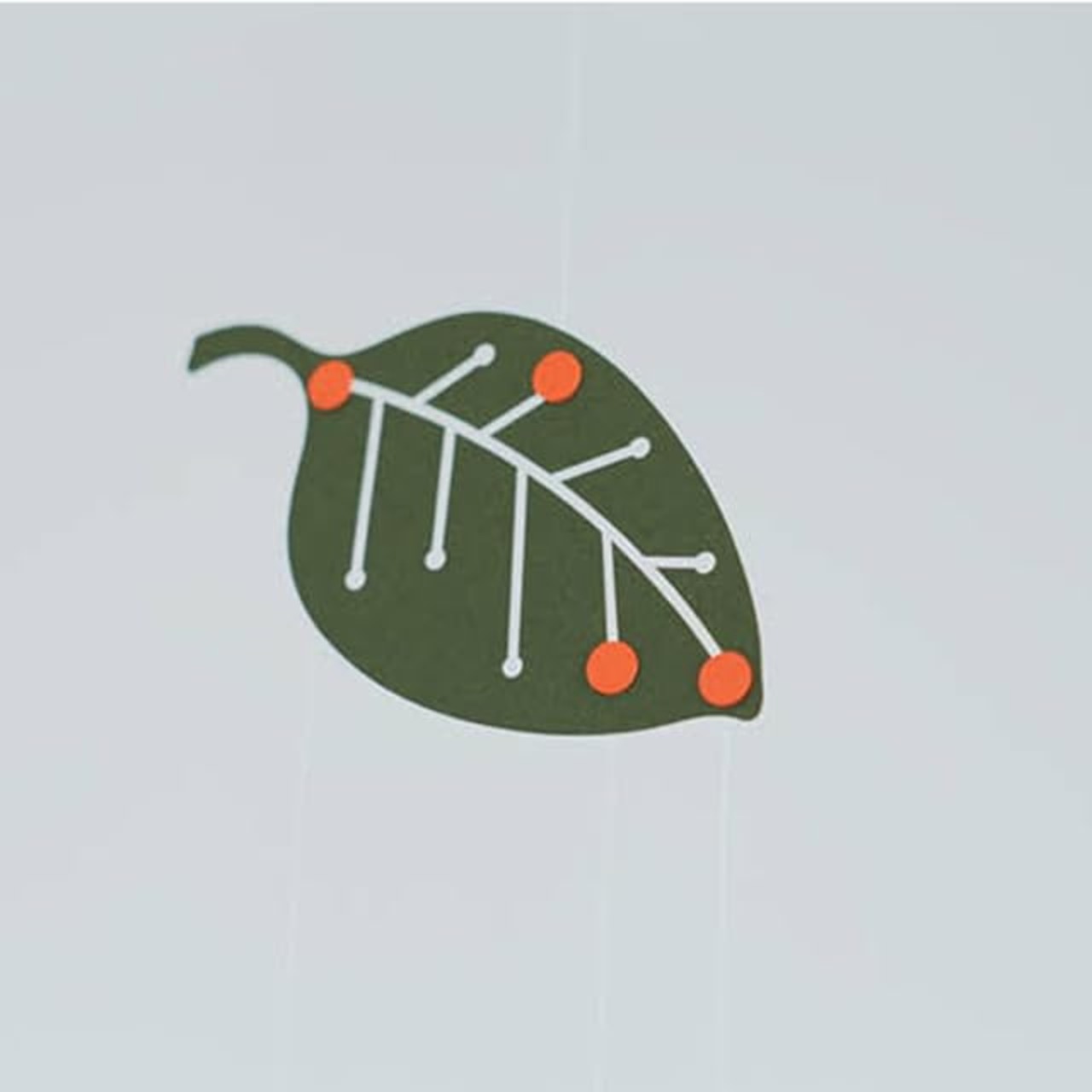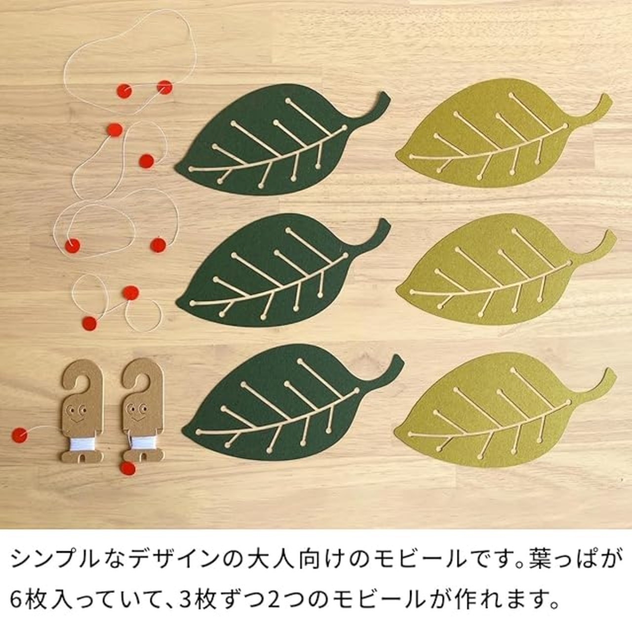 シンプルなデザインの大人向けのモビールです。葉っぱが6枚入っていて、3枚ずつ2つのモビールが作れるようになっています。組み立ても簡単で、木の実をイメージしたオレンジ色のパーツを、葉っぱの切れ込みに引っ掛けるだけで、できあがりです。影を楽しんだり、アロマスプレーをかけて匂いをつけるとお部屋に良い香りも広がります♪