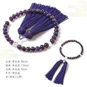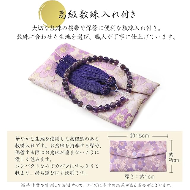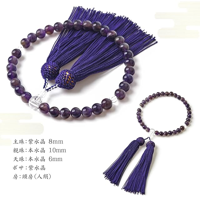 素材親珠:本水晶10mm玉 主珠:紫水晶8mm玉 天珠:本水晶6mm玉 ボサ:本水晶 房:人絹房(紫色) 宗派どの宗派の方でもお使い頂けます。 高級数珠入れ付。 注意・できる限り、実際の商品の色合いに近い状態で撮影しておりますが、パソコン、モニターの環境によって実際の商品と写真の色合いが多少異なって見える場合もございます。 何卒ご理解、ご了承下さいませ。 ・当店で取り扱う天然石は、できる限り品質の良いものを選び、ご提供しておりますが、 天然石は長い年月をかけて自然にできた鉱物ですので、鉱物が生成される過程で取り込んだ特有のインクルージョン(内包物)が、ヒビや曇り、色むら、僅かな傷に見えることがございます。 天然木は、採取の時期により色味や木目の出方が異なります。 ひとつとして同じ物はございませんので、掲載写真と同一の商品をご提供することは不可能です。 また、天然石や天然木の色味のご指定を承ることも致しかねます。 これらは天然素材の証しであり、不良品ではございませんので、返品・交換はお受けすることは出来ません。