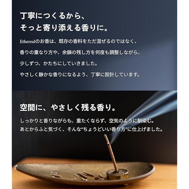 Ethereal(エセリアル)は、香りを通して日常に静かな余白を届けるブランドです。 金木犀の甘くやさしい香りに、ムスクとバニラのニュアンスを重ねた奥行きのあるフローラルノート。 どこか懐かしく、心をほどくような香りが広がります。 1本あたり約30分。13.5cmのスリムなスティックタイプで、 読書・ヨガ・瞑想・就寝前など、整えたい時間におすすめです。 ・日本国内で丁寧に調合・製造 ・30本入り(お香立ては付属していません) ・シンプルなパッケージはギフトにも最適です 日々の中に、小さな香りの時間を。 Etherealのお香で、あなたの空間を整えてみませんか。