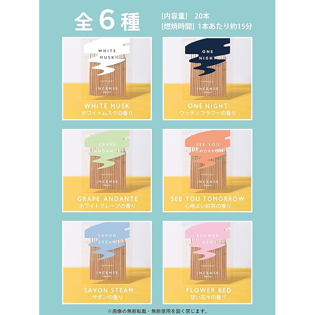 ●色をモチーフにした日常生活に香りと彩りをくれるインセンスシリーズ「TINTSCENT」。香りも色を纏った様な印象の6種類<br>●キャッチーなデザインと手に取りやすい小ぶりなサイズ感で、見た目を可愛らしい印象に<br>●太陽の光を浴びた清潔感のあるサボンの香り<br>●燃焼時間は1本あたり約15分