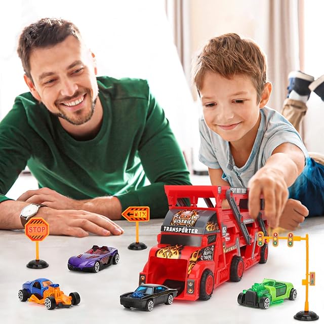 車 おもちゃ:大きな車運搬トラック、8つのミニカーのおもちゃ、様々な道路標識とバンパーステッカーが含まれています。