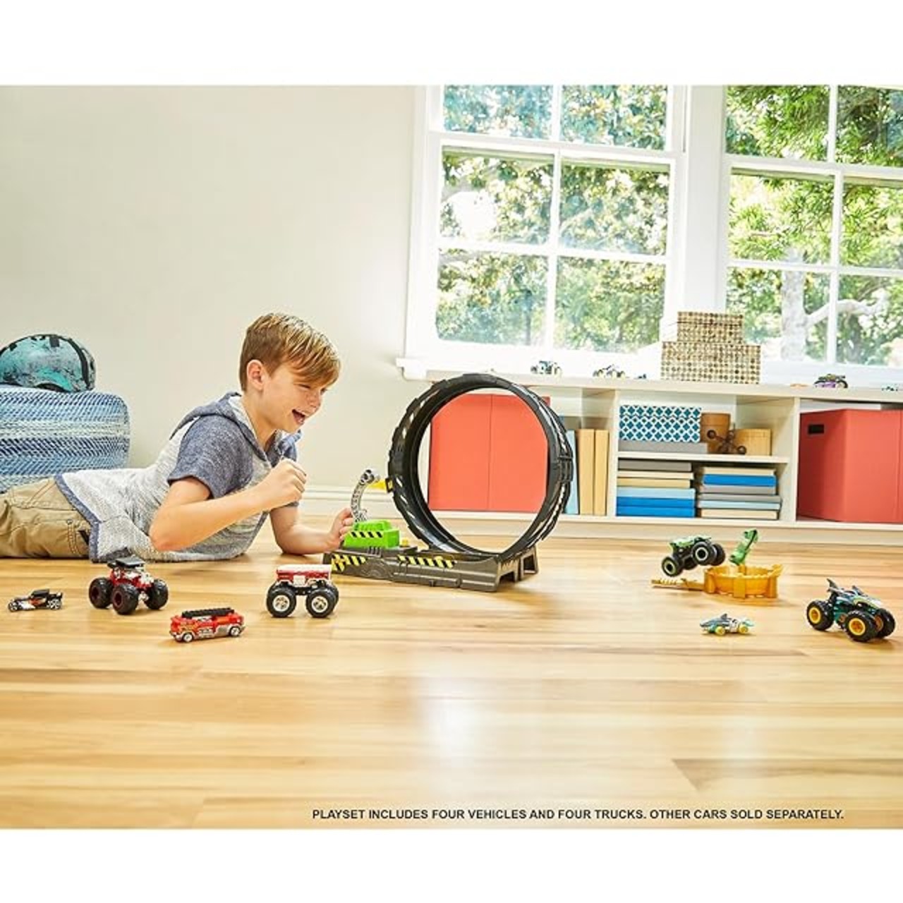 商品名:ホットウィール(Hot Wheels) モンスタートラック ビッグループ チャレンジ プレイセット【ミニカー プレイセット】モンスタートラック×4、ミニカー×4 計8台付 【4才~】 HGV15