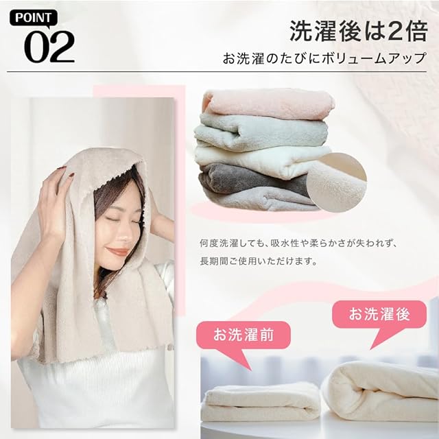 【摩擦フリーケア】ふわもこダブルレイヤー生地が髪を優しく包み込み、摩擦ゼロのヘアケアを実現。キューティクル保護効果でツヤ髪をキープし、就寝時やプール後の髪絡み防止にも最適。肌に触れる部分はナノシリコン加工で、洗濯後も持続する柔らかさが特徴です。