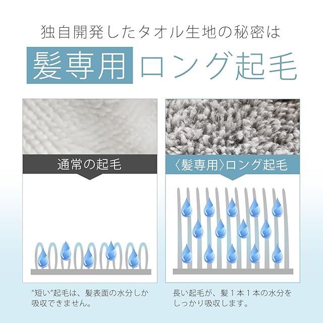 髪専用の長い起毛を採用しているので、髪1本1本の水分をしっかり吸水することができます。